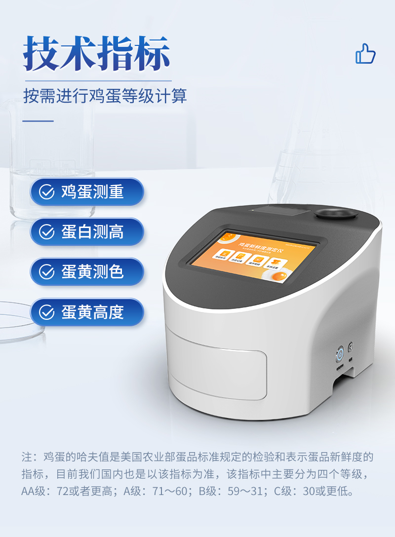 雞蛋品質分析儀技術指標:雞蛋測重,蛋白測高,蛋黃測色,哈夫值顯示,蛋黃高度等,可進行雞蛋等級計算。雞蛋的哈夫值是美國農業部蛋品標準規定的檢驗和表示蛋品新鮮度的指標,目前我們國內也是以該指標為準,該指標中主要分為四個等級,AA級:72或者更高;A級:71~60;B級:59~31;C級:30或更低。