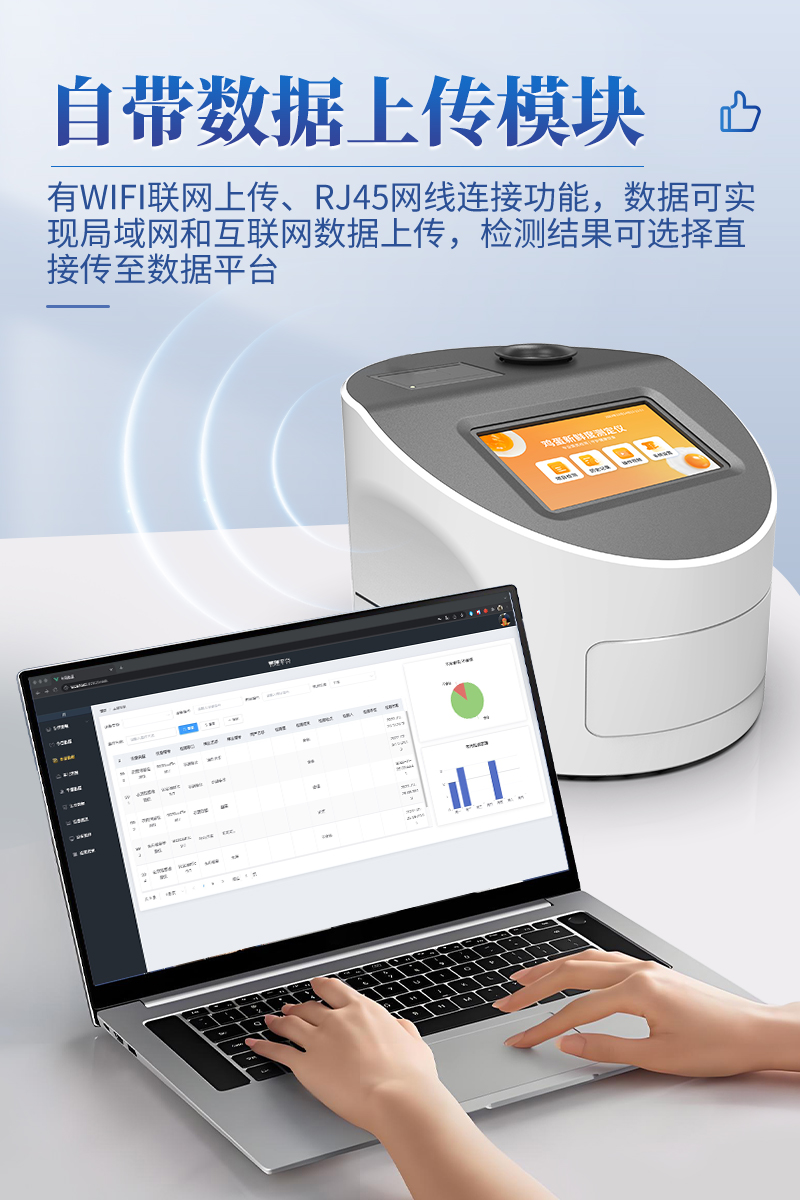 7.儀器可本機存儲數據,可連接USB端口將數據導出存儲。另外,儀器自帶數據上傳模塊,具有WIFI聯網上傳、RJ45網線連接功能,數據可實現局域網和互聯網數據上傳,檢測結果可選擇直接傳至數據平臺,進行大數據分析處理與數據統計,達到長期分析監測的目的。