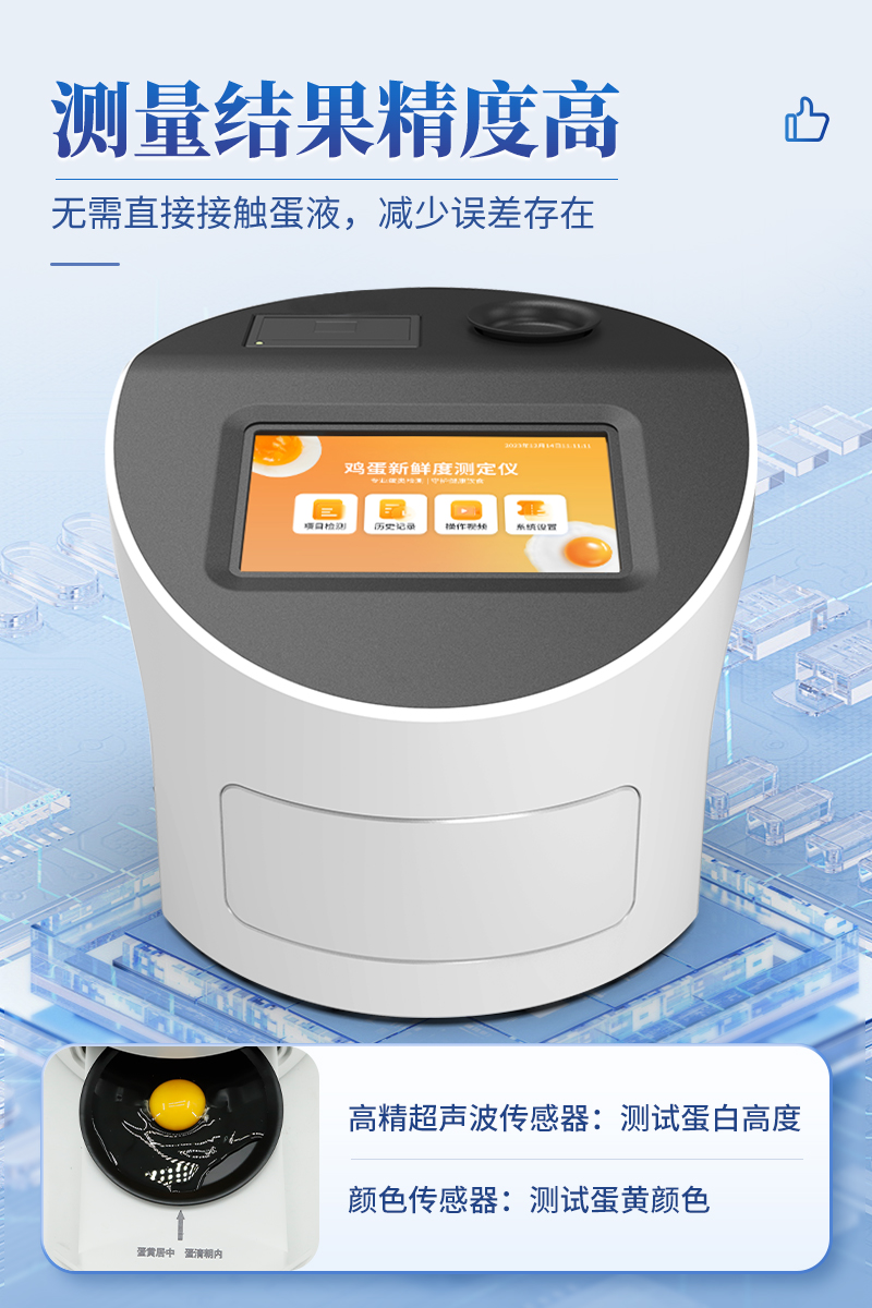 4.創新采用高精超聲波傳感器測試蛋白高度,精密傳感器測試蛋黃顏色,無需直接接觸蛋液,減少誤差存在。