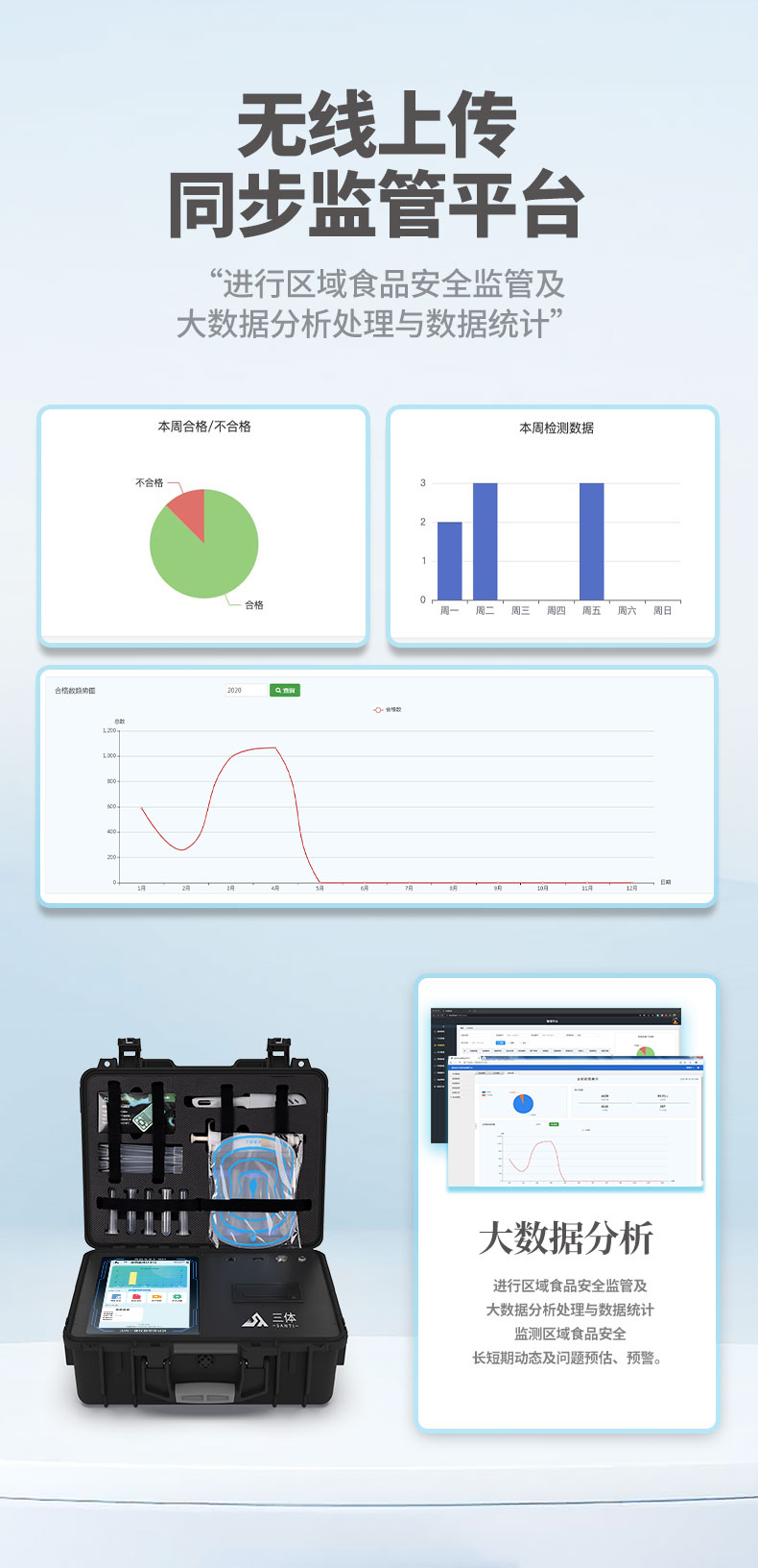11、儀器具有 wifi 聯(lián)網(wǎng)上傳、RJ45網(wǎng)線連接功能,可以快速上傳數(shù)據(jù)。同步對(duì)接監(jiān)管平臺(tái),數(shù)據(jù)可局域網(wǎng)和互聯(lián)網(wǎng)數(shù)據(jù)上傳,檢測結(jié)果直接傳至食品安全監(jiān)管平臺(tái)。進(jìn)行區(qū)域食品安全監(jiān)管及大數(shù)據(jù)分析處理與數(shù)據(jù)統(tǒng)計(jì),檢測區(qū)域食品安全長短期動(dòng)態(tài),達(dá)到食品安全問題預(yù)估、預(yù)警。